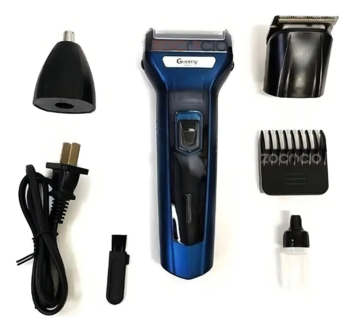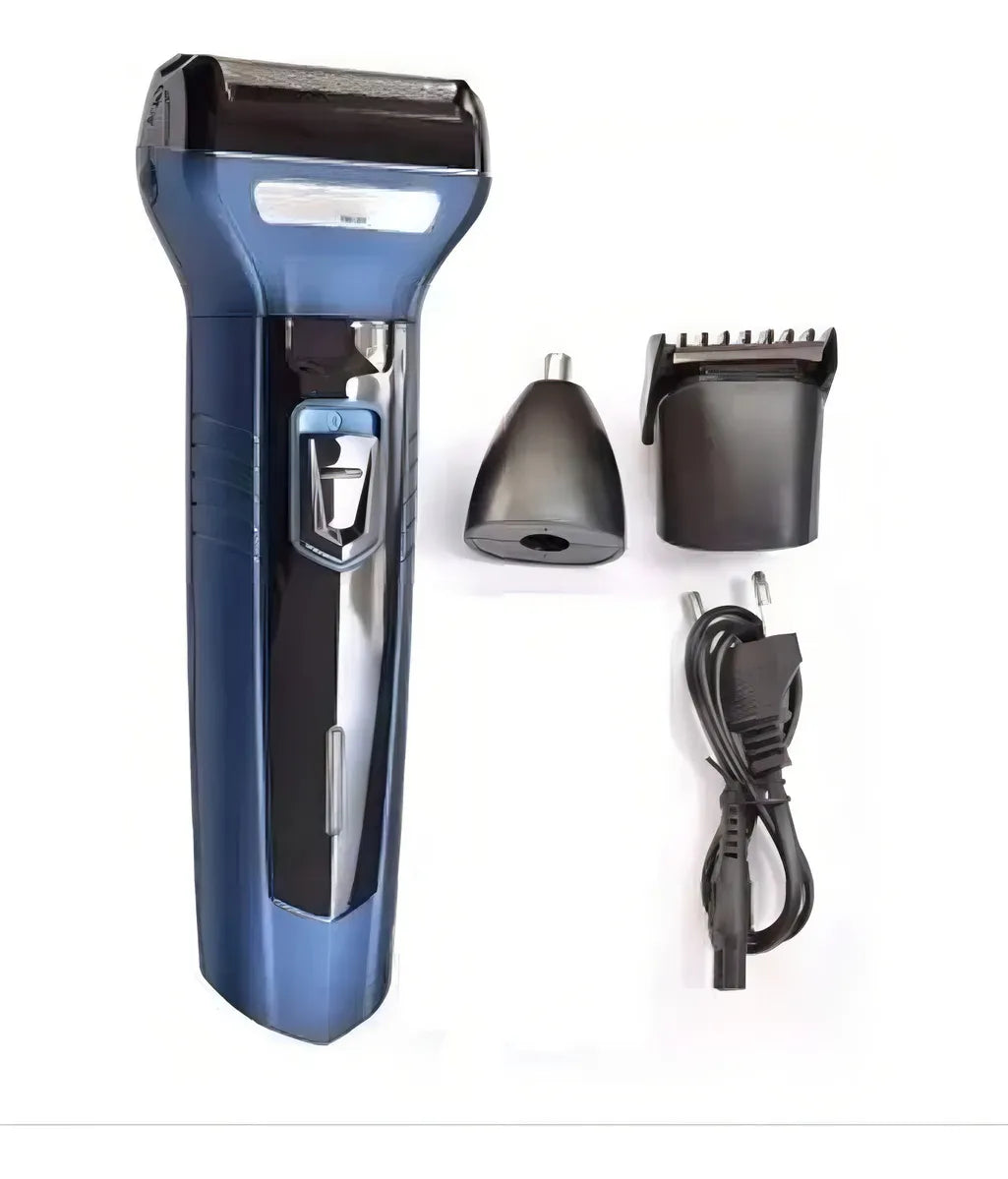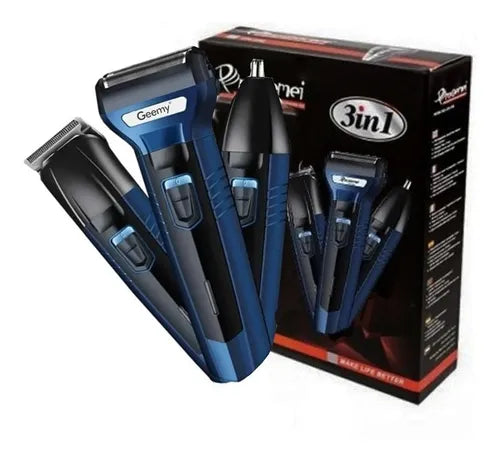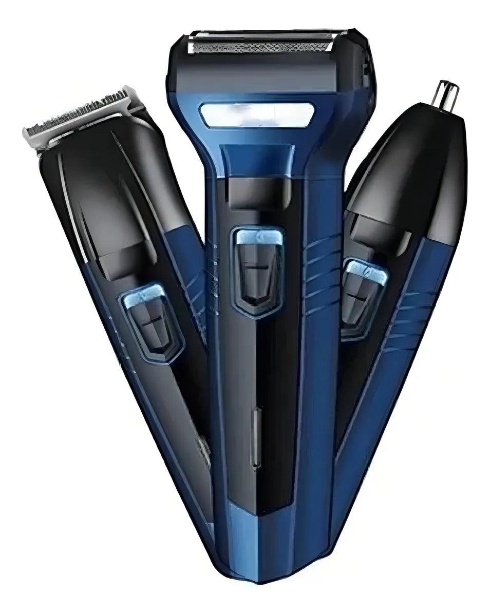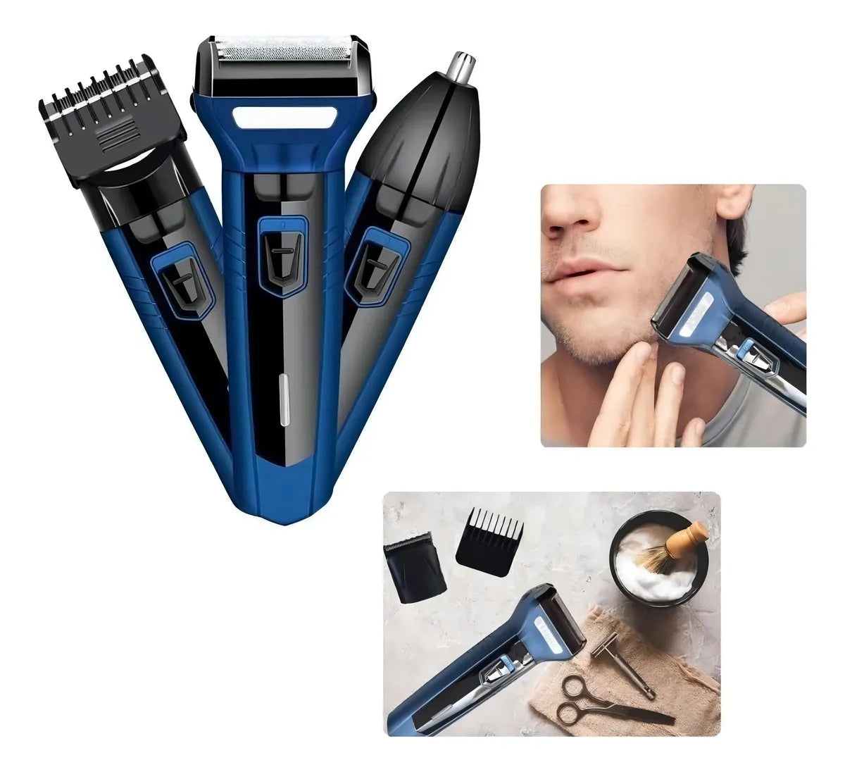Máquina de afeitar 3 en 1 con tres cabezales intercambiables para rasurar la barba, cortar el cabello y quitar los vellos de nariz, orejas y cejas.